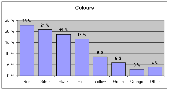 Which are the most popular barchetta colours? It is impossible to make conclusions based on the Finnish cars because there are so few of them. However the German website www.mobile.de has lots of barchettas for sale and it is a good source of information. There was 827 barchettas for sale on 24 February 2003. The chart below shows which colours were the most popular: