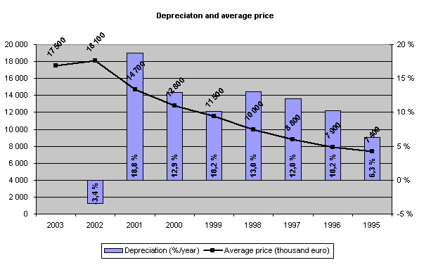 How big is the depreciation of barchetta in Germany? By using the www.mobile.de as an information source I calculated the average yearly depreciation of barchetta. The figures below are based on the information gathered from www.mobile.de on 24 February 2003. At that time there was 827 barchettas for sale. There was only one car registered in 2003 which means that the depreciation figure between 2002 and 2003 is not reliable.